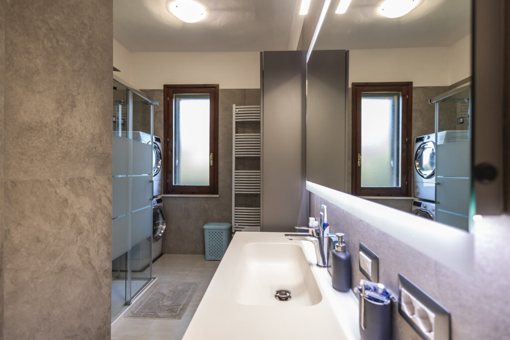 Piano seminterrato: ampia tavernetta con uscita diretta al portico, lavanderia e tre locali multiuso, pronti a trasformarsi in studio creativo, palestra privata o stanza hobby.